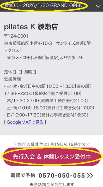 ピラティスK(pilates K)と綾瀬店の基本情報