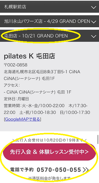 「屯田店」を選択し、「先行入会&体験レッスン受付中」をクリック(タップ)します。