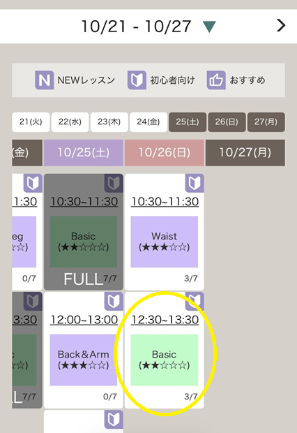 予約可能な体験レッスンが表示されるので希望のプログラムを予約します。