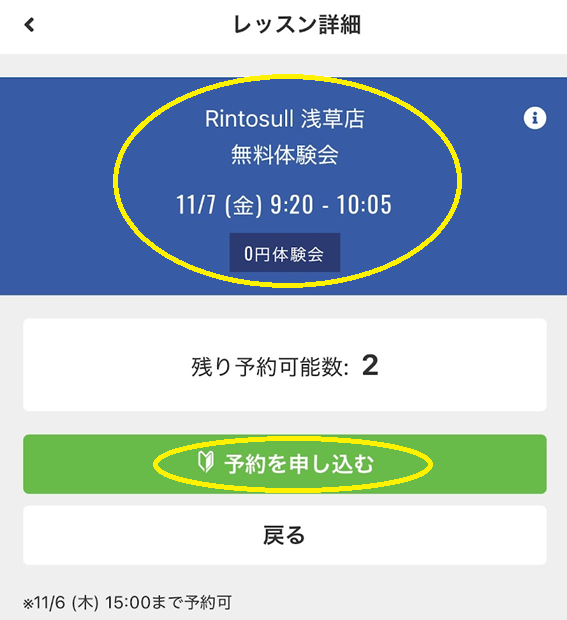 予約フォームhttps://rintosull.hacomono.jp/から予約が可能です。※LAVAコラボ店での体験レッスンは、Web/LINEまたは