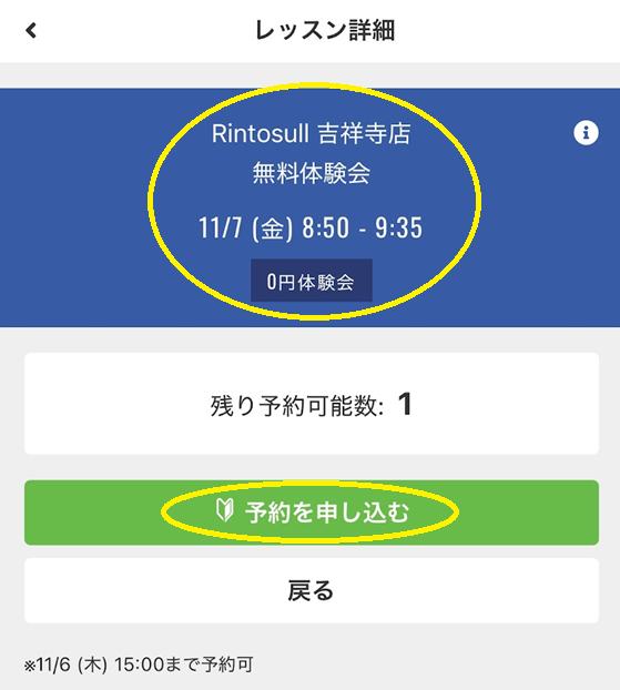 予約フォームhttps://rintosull.hacomono.jp/から予約が可能です。※LAVAコラボ店での体験レッスンは、Web/LINEまたは