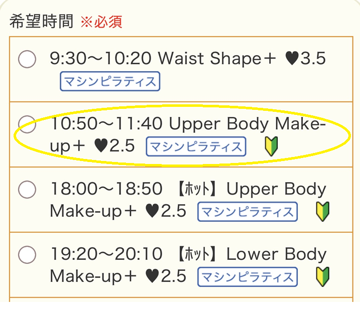 「マシンピラティス」のレッスンから希望の内容・時間を選びます。