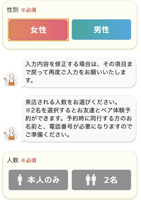 「体験レッスンご予約ページ」で参加する方の性別・人数を選択します。