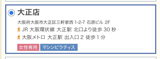 大正駅から近く、通いやすいところが気に入っています。インストラクターさんも、みなさん丁寧に動きを見てくださるので、モチベーションが上がります。姿勢改善とお腹周りのダイエット目的で通っていますが、少しずつ効果が出てきました。
