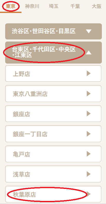 エリアは「東京」と「台東区・千代田区・中央区・江東区」、スタジオは「秋葉原店」をクリック(タップ)します。