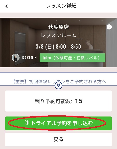 希望の店舗と日時を確認し、「トライアル予約を申し込む」をクリック(タップ)します。