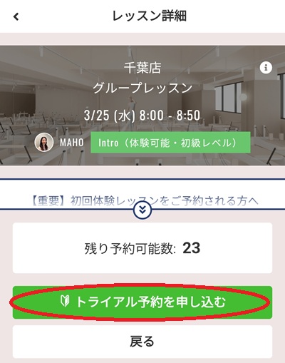希望の店舗と日時を確認し、「トライアル予約を申し込む」をクリック(タップ)します。