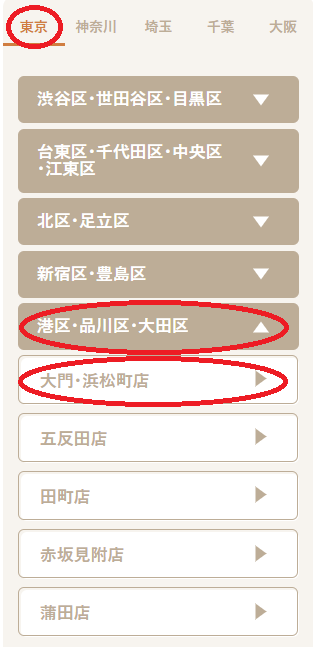 エリアは「東京」と「港区・品川区・大田区」、スタジオは「大門・浜松町店」をクリック(タップ)します。