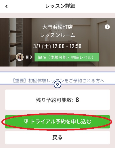 希望の店舗と日時を確認し、「トライアル予約を申し込む」をクリック(タップ)します。