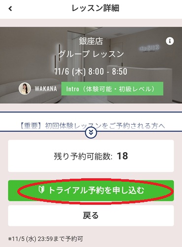 希望の店舗と日時を確認し、「トライアル予約を申し込む」をクリック(タップ)します。