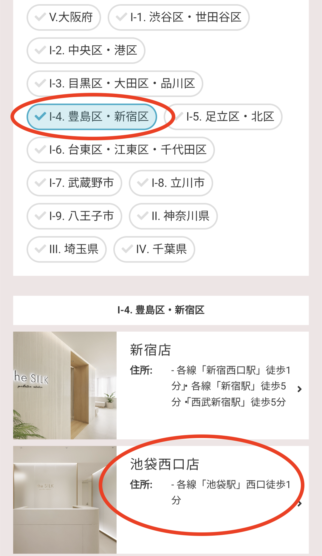 エリアは「豊島区・新宿区」、スタジオは「池袋西口店」をクリック(タップ)します。