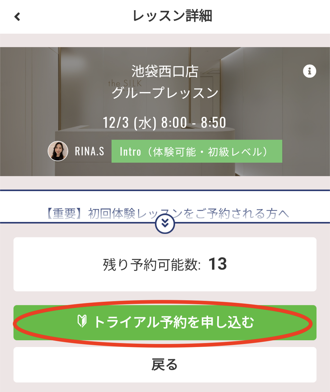 希望の店舗と日時を確認し、「トライアル予約を申し込む」をクリック(タップ)します。