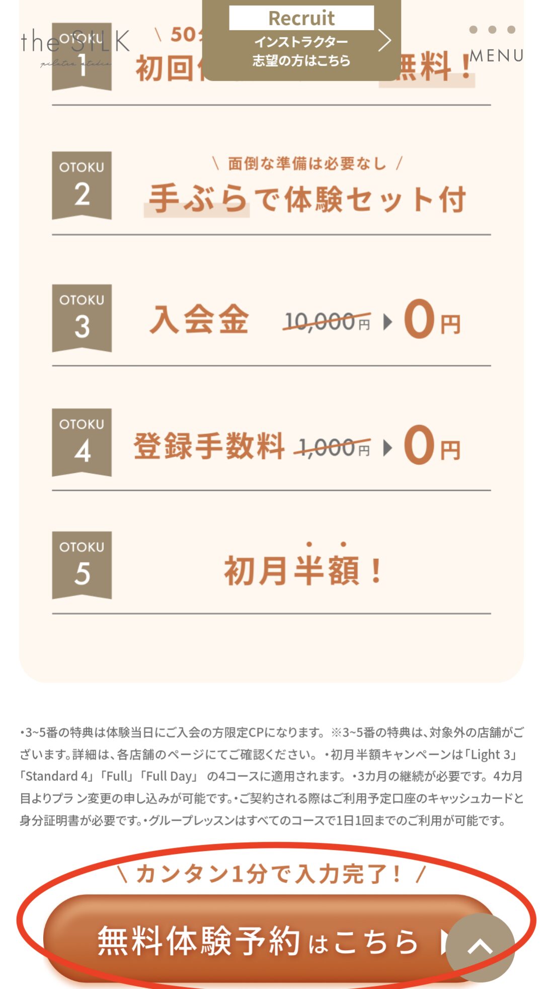 体験当日の入会限定で、入会金や登録手数料が無料になるキャンペーンを開催していますので、事前にthe SILKの公式サイトで確認しておくことをおすすめします。