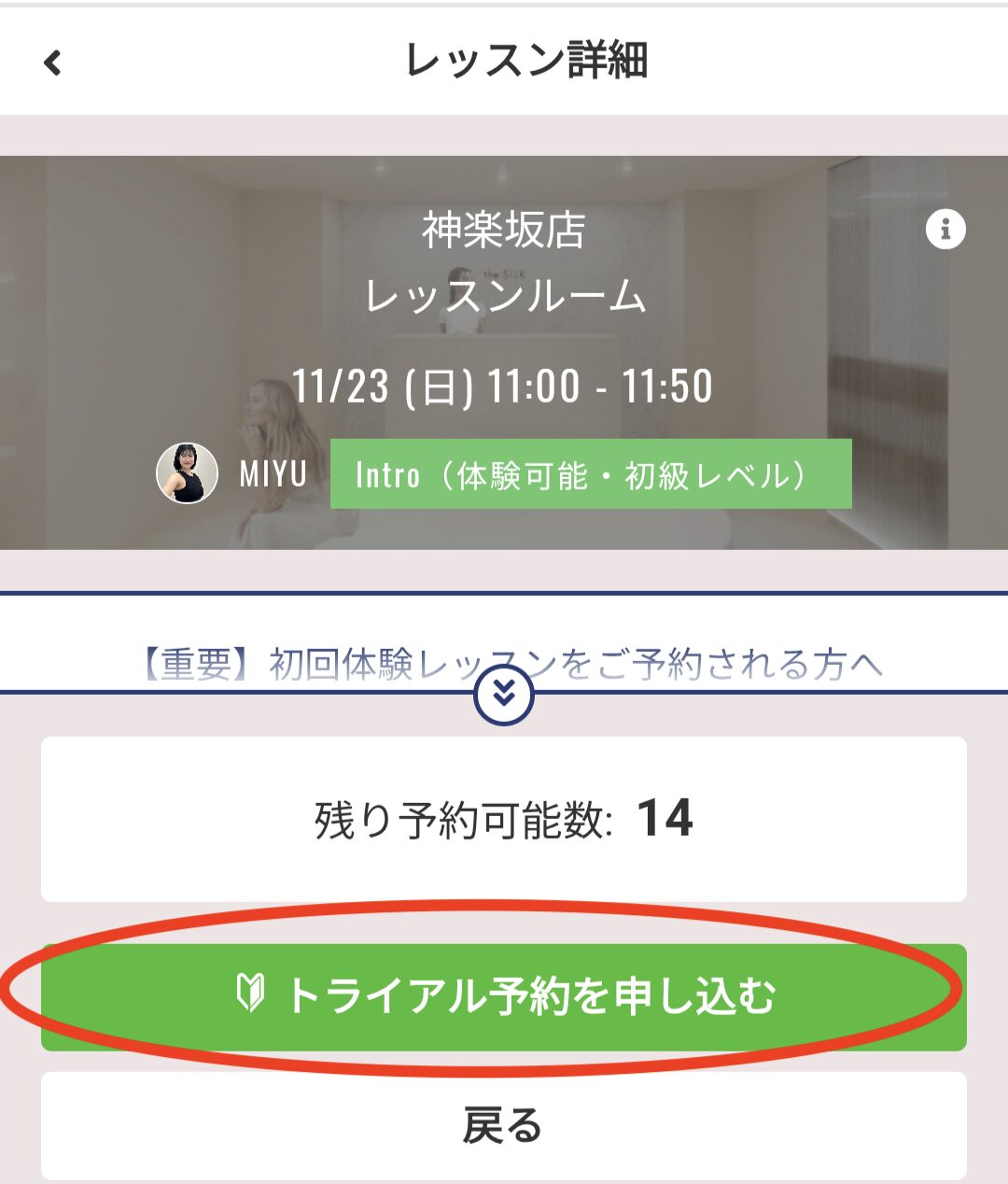 希望の店舗と日時を確認し、「トライアル予約を申し込む」をクリック(タップ)します。