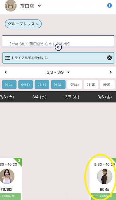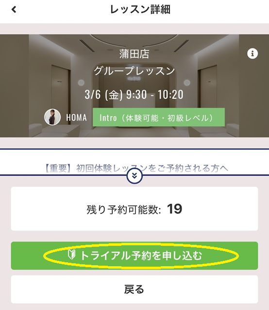希望の店舗と日時を確認し、「トライアル予約を申し込む」をクリック(タップ)します。