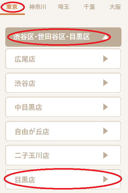 エリアは「東京」と「渋谷区・世田谷区・目黒区」、スタジオは「目黒店」をクリック(タップ)します。