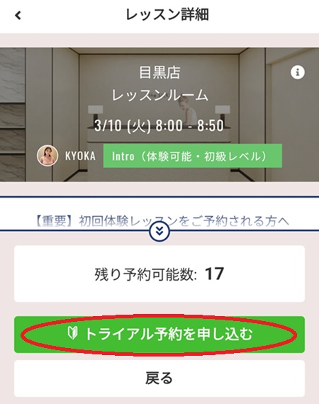 希望の店舗と日時を確認し、「トライアル予約を申し込む」をクリック(タップ)します。
