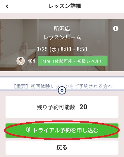 希望の店舗と日時を確認し、「トライアル予約を申し込む」をクリック(タップ)します。
