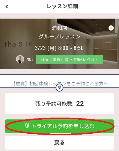 希望の店舗と日時を確認し、「トライアル予約を申し込む」をクリック(タップ)します。