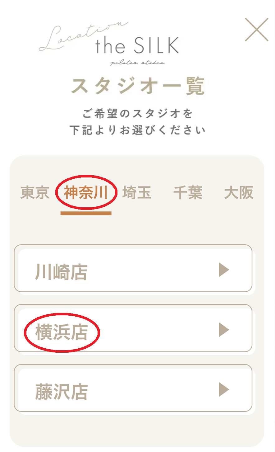 エリアは「神奈川」、スタジオは「横浜店」をクリック(タップ)します。