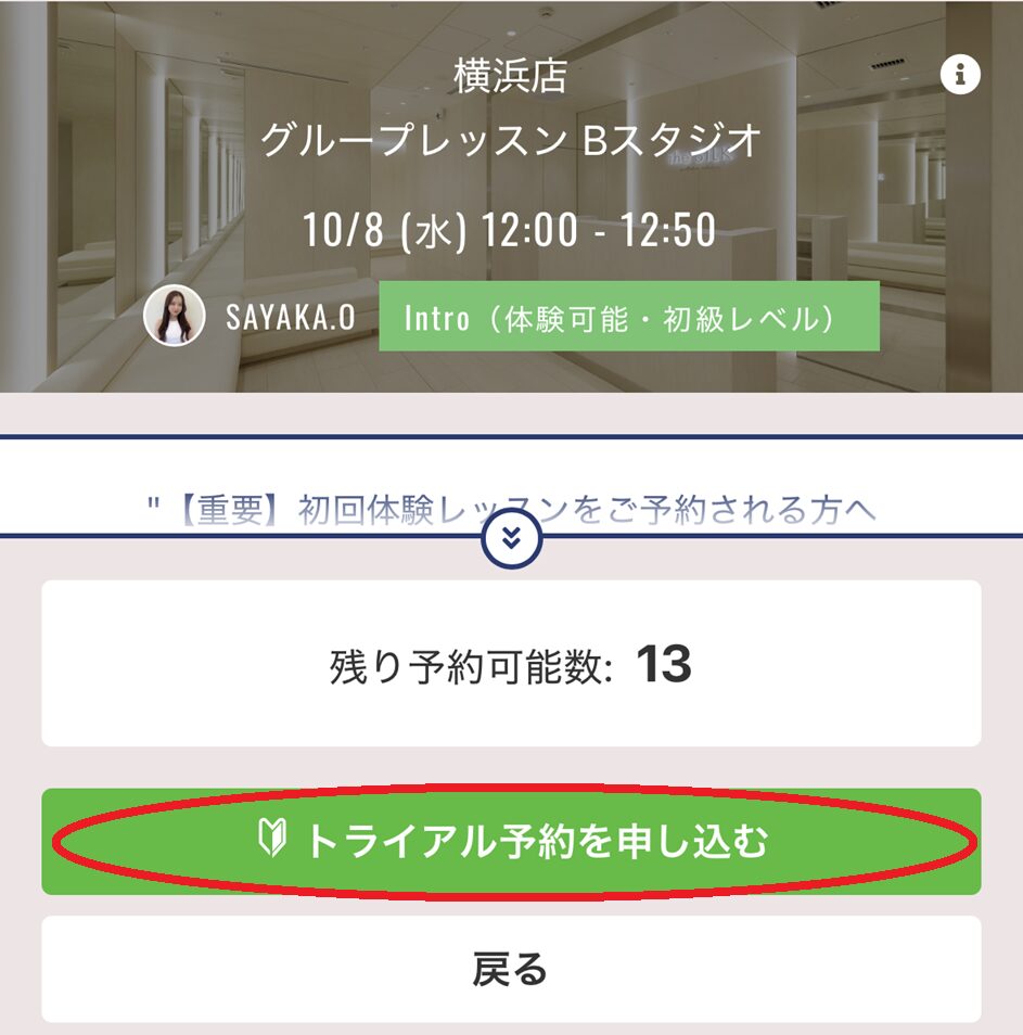 希望の店舗と日時を確認し、「トライアル予約を申し込む」をクリック(タップ)します。