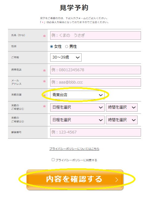 来館店舗は「青葉台店」を選択し、必須入力項目、来館希望日を記入して「内容を確認する」をクリック(タップ)。入力内容に間違いがなければ送信し予約完了です。