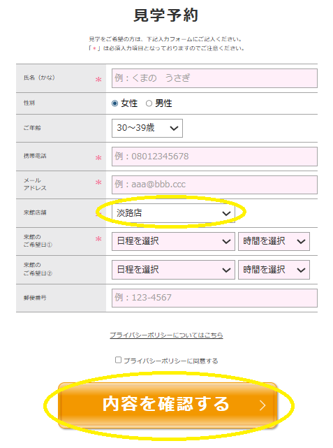 来館店舗は「淡路店」を選択し、必須入力項目、来館希望日を記入して「内容を確認する」をクリック(タップ)。入力内容に間違いがなければ送信し予約完了です。