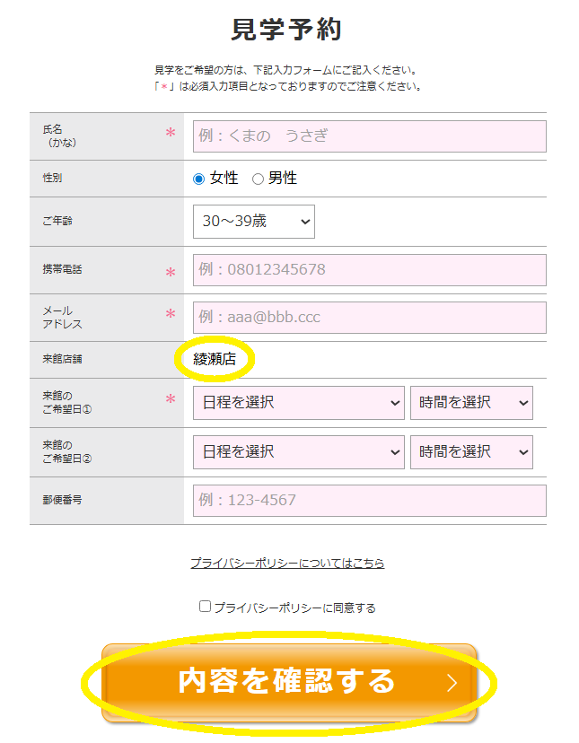 来館店舗は「綾瀬店」を選択し、必須入力項目、来館希望日を記入して「内容を確認する」をクリック(タップ)。入力内容に間違いがなければ送信し予約完了です。