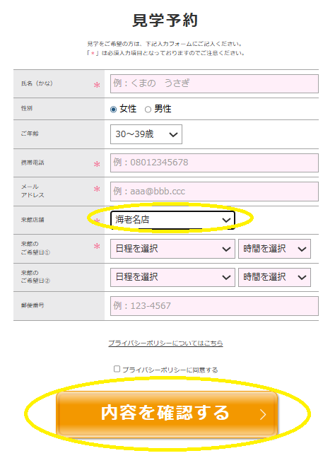 来館店舗は「海老名店」を選択し、必須入力項目、来館希望日を記入して「内容を確認する」をクリック(タップ)。入力内容に間違いがなければ送信し予約完了です。