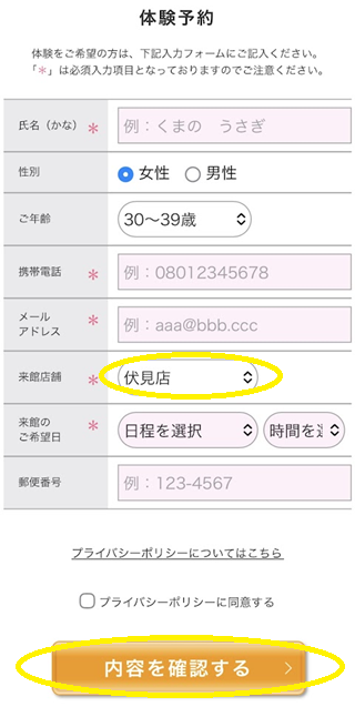 来館店舗は「伏見店」を選択し、必須入力項目、来館希望日を記入して「内容を確認する」をクリック(タップ)。入力内容に間違いがなければ送信し予約完了です。