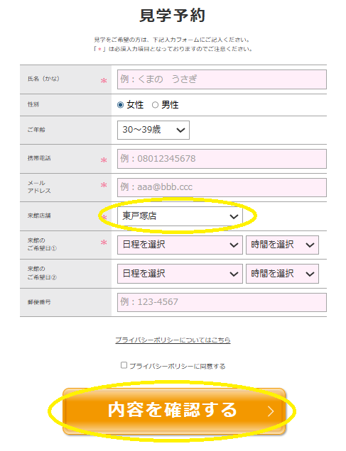 来館店舗は「東戸塚店」を選択し、必須入力項目、来館希望日を記入して「内容を確認する」をクリック(タップ)。入力内容に間違いがなければ送信し予約完了です。