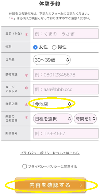 来館店舗は「今池店」を選択し、必須入力項目、来館希望日を記入して「内容を確認する」をクリック(タップ)。入力内容に間違いがなければ送信し予約完了です。
