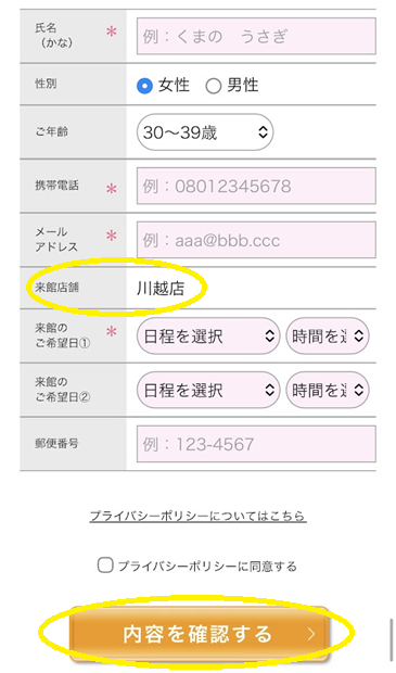 来館店舗は「川越店」を選択し、必須入力項目、来館希望日を記入して「内容を確認する」をクリック(タップ)。入力内容に間違いがなければ送信し予約完了です。