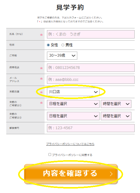 来館店舗は「川口店」を選択し、必須入力項目、来館希望日を記入して「内容を確認する」をクリック(タップ)。入力内容に間違いがなければ送信し予約完了です。