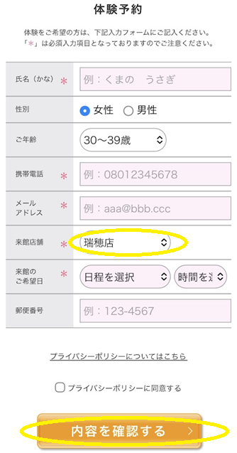 来館店舗は「瑞穂店」を選択し、必須入力項目、来館希望日を記入して「内容を確認する」をクリック(タップ)。入力内容に間違いがなければ送信し予約完了です。