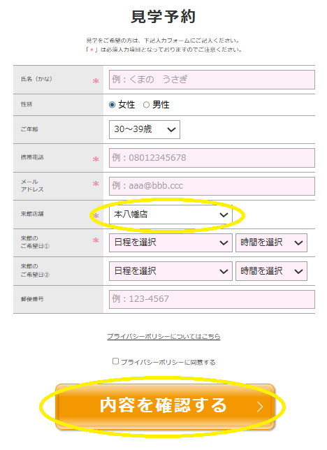 来館店舗は「本八幡店」を選択し、必須入力項目、来館希望日を記入して「内容を確認する」をクリック(タップ)。入力内容に間違いがなければ送信し予約完了です。