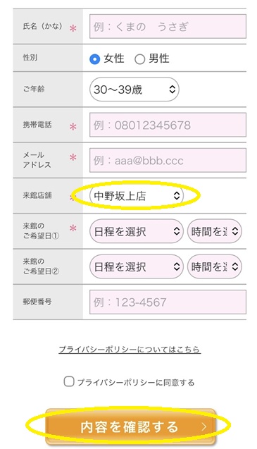 来館店舗は「中野坂上店」を選択し、必須入力項目、来館希望日を記入して「内容を確認する」をクリック(タップ)。入力内容に間違いがなければ送信し予約完了です。