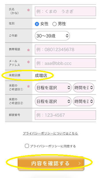 来館店舗は「成増店」を選択し、必須入力項目、来館希望日を記入して「内容を確認する」をクリック(タップ)。入力内容に間違いがなければ送信し予約完了です。