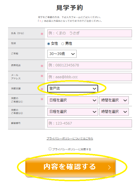 来館店舗は「登戸店」を選択し、必須入力項目、来館希望日を記入して「内容を確認する」をクリック(タップ)。入力内容に間違いがなければ送信し予約完了です。