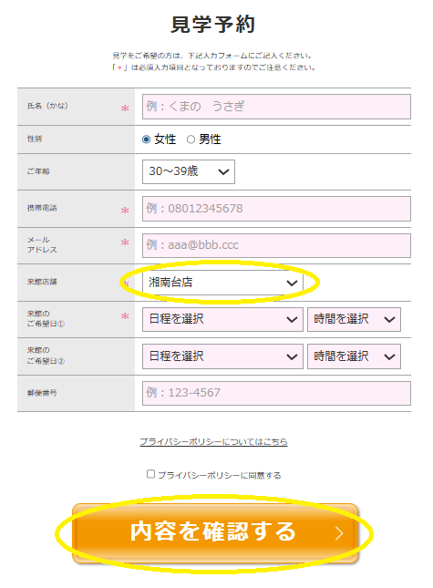 来館店舗は「湘南台店」を選択し、必須入力項目、来館希望日を記入して「内容を確認する」をクリック(タップ)。入力内容に間違いがなければ送信し予約完了です。