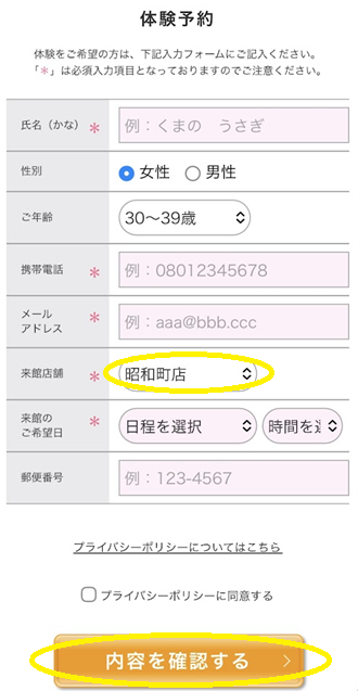 来館店舗は「昭和町店」を選択し、必須入力項目、来館希望日を記入して「内容を確認する」をクリック(タップ)。入力内容に間違いがなければ送信し予約完了です。