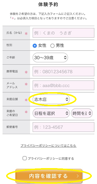 来館店舗は「志木店」を選択し、必須入力項目、来館希望日を記入して「内容を確認する」をクリック(タップ)。入力内容に間違いがなければ送信し予約完了です。