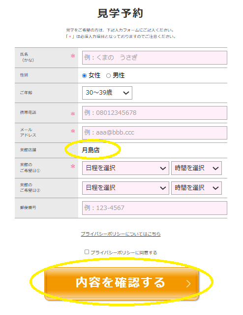 来館店舗は「月島店」を選択し、必須入力項目、来館希望日を記入して「内容を確認する」をクリック(タップ)。入力内容に間違いがなければ送信し予約完了です。